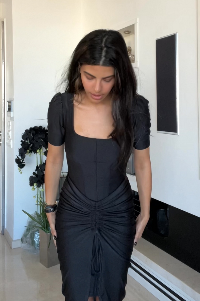 בגד גוף + חצאית כיווץ של דגם 'טופז' שחור בגזרת שרוולים קצרה